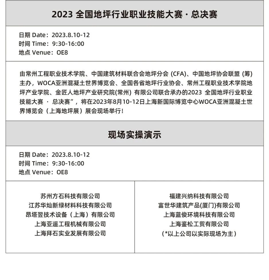 2023全国地坪行业职业技能大赛·总决赛 参赛选手理论考试、WOCA亚洲地坪奖技术交流会暨工程项目介绍、金镘刀颁奖典礼暨技术交流会、海外嘉宾专场、商贸洽谈等多重会议活动在WOCA2023第二日的现场展开,一起来看活动盛况!